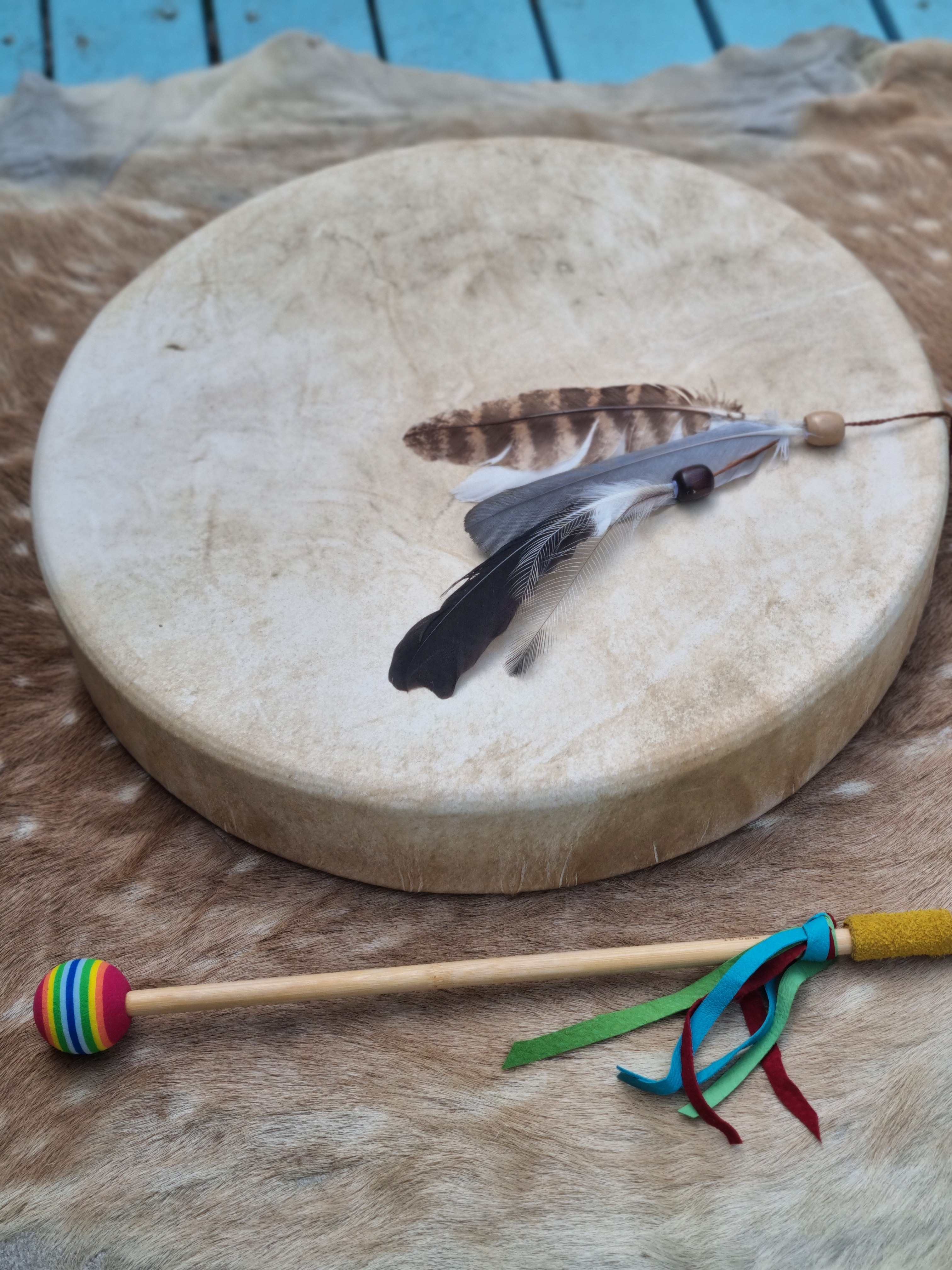 The versatile nature of Native Drums skins, invite us to play them in several ways and not necessarily just with the traditional Drum Beater. With both hands holding the frame and finger tapping, or just one hand, cupped hand, flat hand, finger tips or full finger striking while holding the drum at the back, standing or sitting or sitting crossed legged with the drum tilted, and also straddled between the knees and used as a bongo style drum. It can be held with the natural handle formed by the lacing on the back and other hand used to play, with or without the traditional beater of course …a drum for all reasons and seasons.