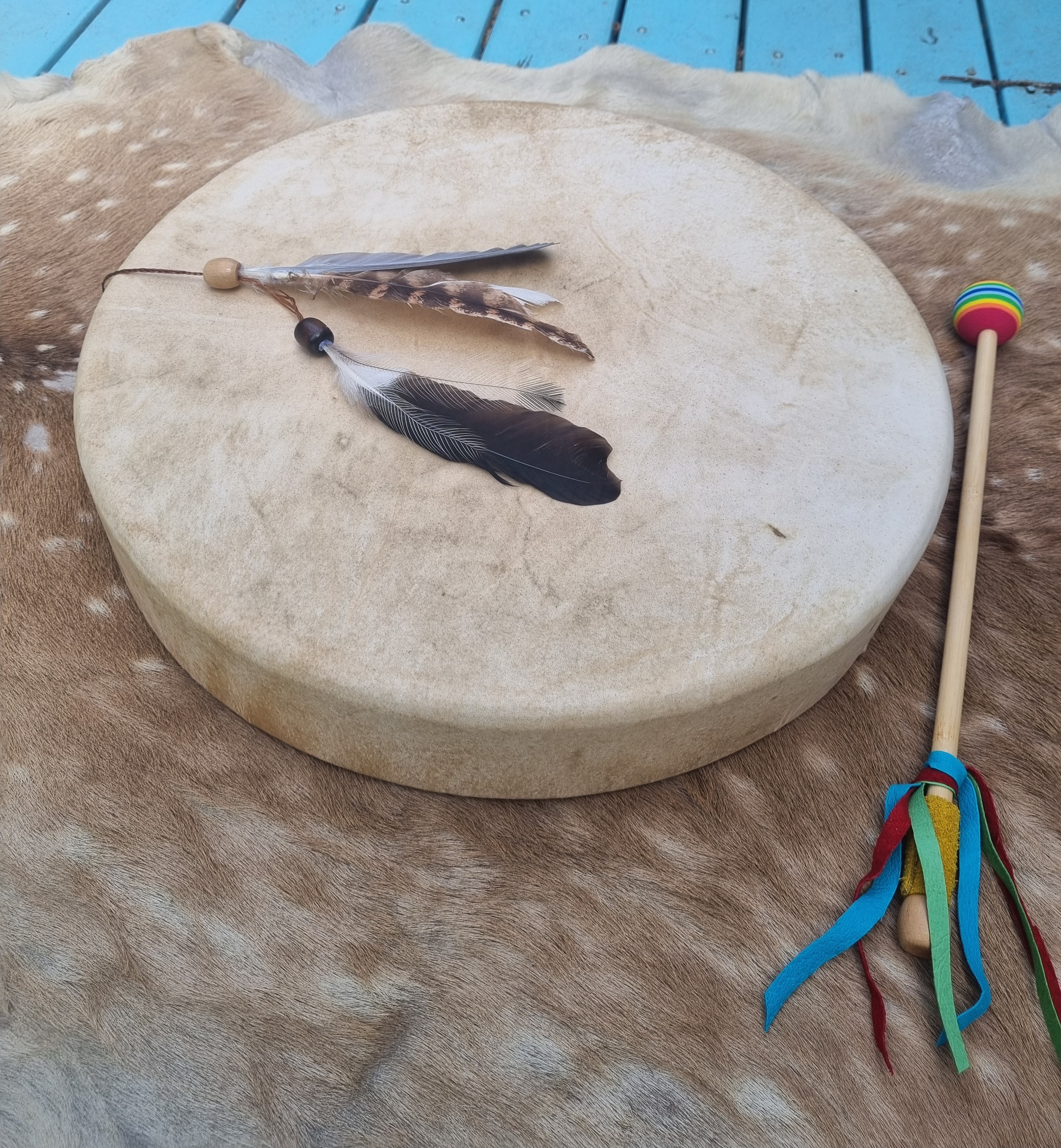 This is a creative loving instrument for healing & for connection to spirit & soul. In Native traditions it is believed that the drum is a living thing & the spirit of the animals & trees of which the drum is made, live in the drum. When a drum finds a partner , it is a life-long relationship. Drumming can provide solace, relief from anger, courage when afraid, unites drummer with all life form - a single heartbeat restoring balance & harmony, which can heal & soothe the mind & reach our very soul.