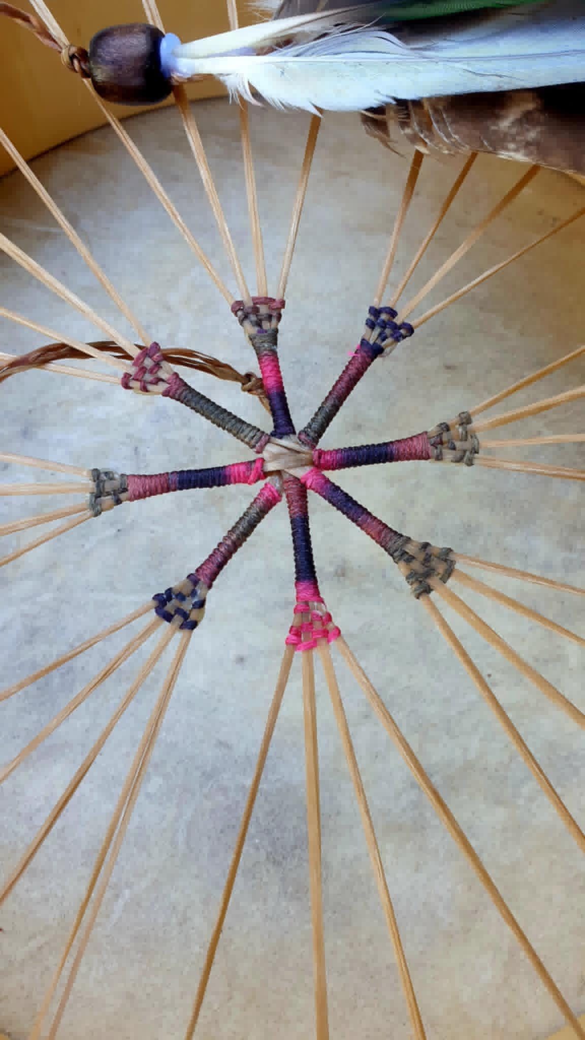 The versatile nature of Native Drums skins, invite us to play them in several ways and not necessarily just with the traditional Drum Beater. With both hands holding the frame and finger tapping, or just one hand, cupped hand, flat hand, finger tips or full finger striking while holding the drum at the back, standing or sitting or sitting crossed legged with the drum tilted, and also straddled between the knees and used as a bongo style drum. It can be held with the natural handle formed by the lacing on the back and other hand used to play, with or without the traditional beater of course …a drum for all reasons and seasons.