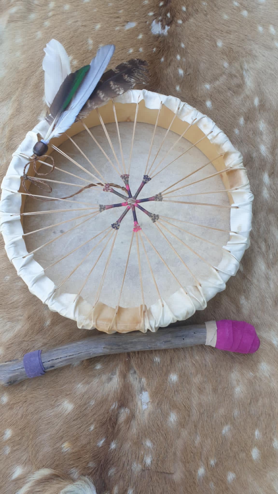 In essence, this sacred hoop drum is a vessel of ancestral wisdom and divine energy, holding the stories, traditions, and spiritual essence of those who have walked this earth before us, providing a profound connection to our roots and a channel for spiritual growth.....and with these markings and subtle pure energies and features appears to hold all the possibilities of the universe...nature at its finest.