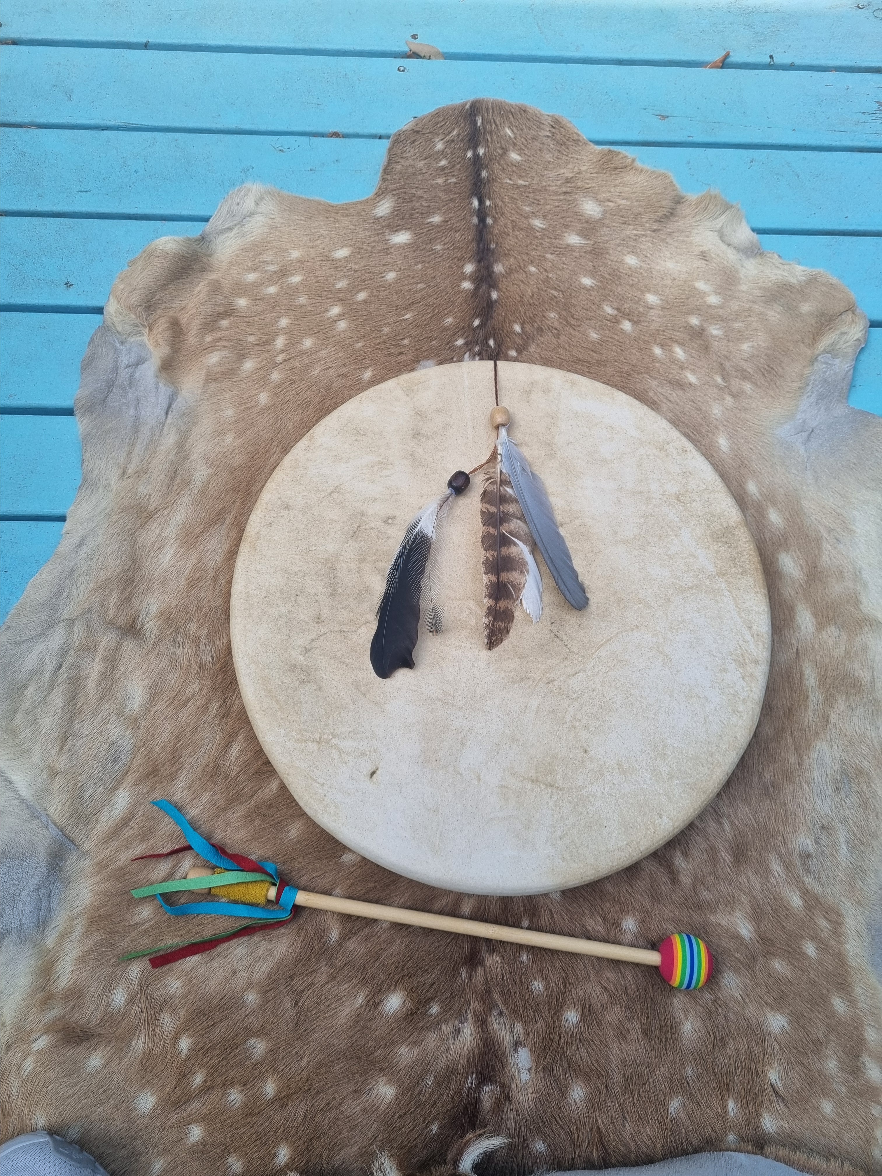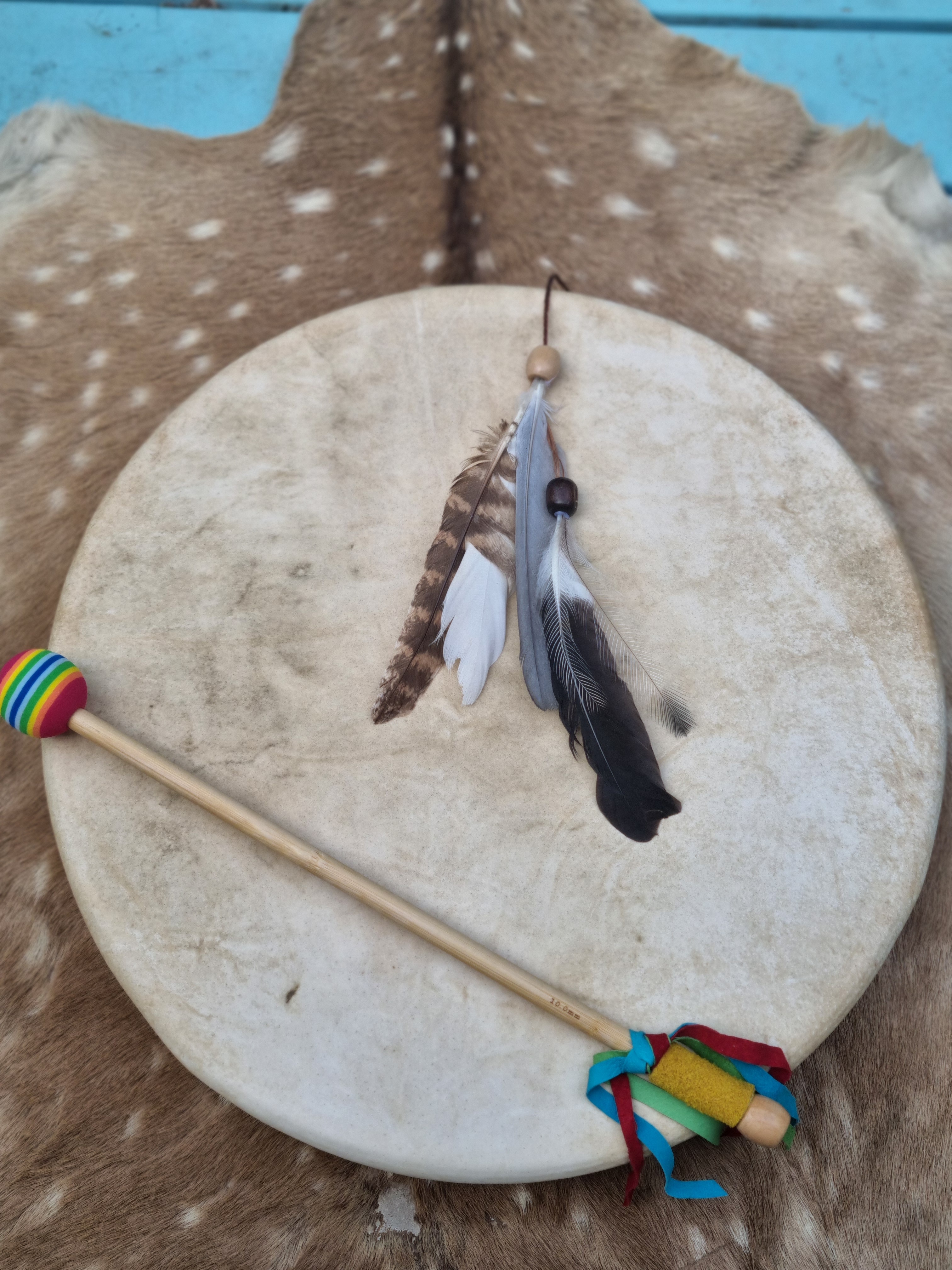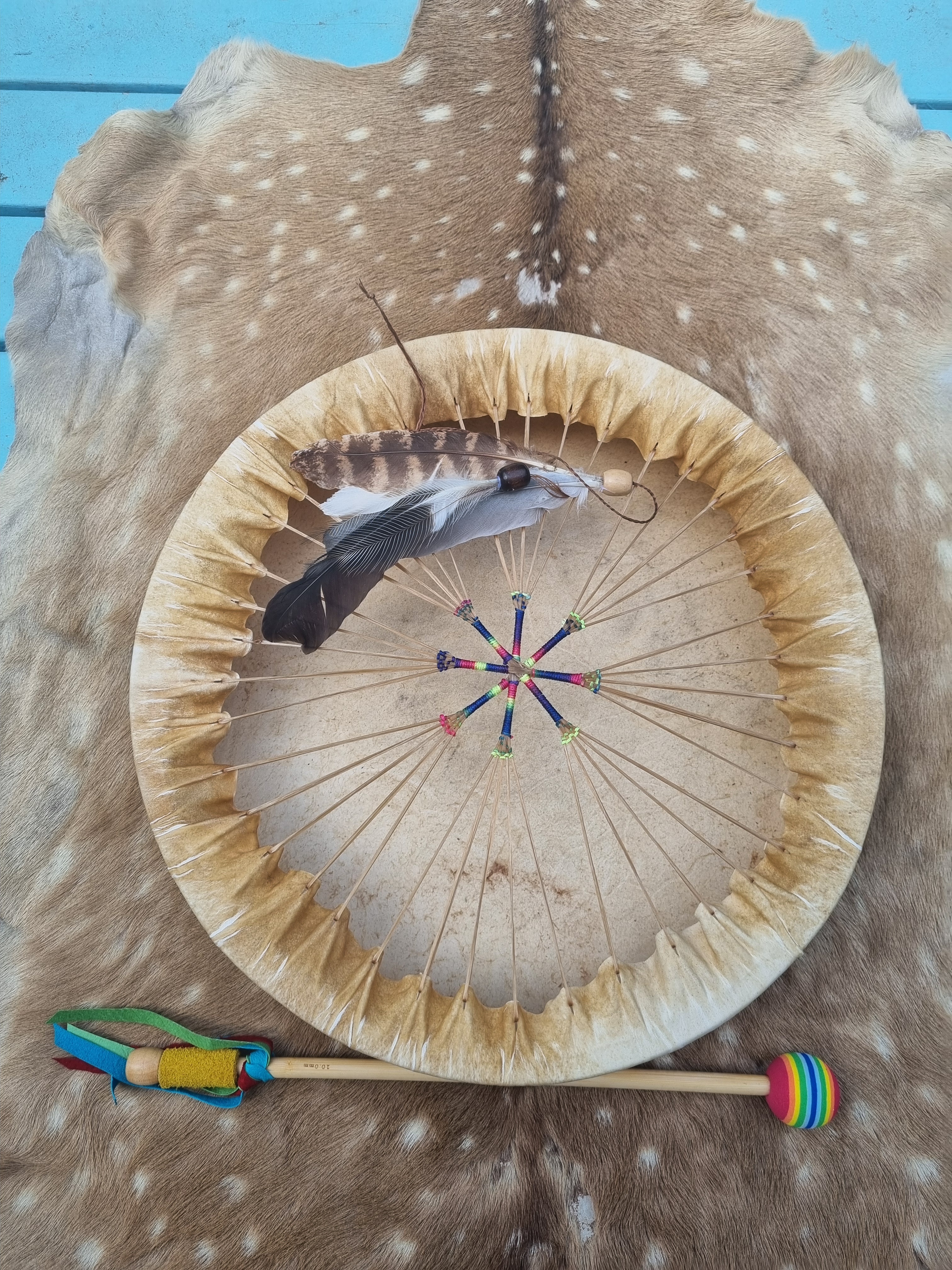 The versatile nature of Native Drums skins, invite us to play them in several ways and not necessarily just with the traditional Drum Beater. With both hands holding the frame and finger tapping, or just one hand, cupped hand, flat hand, finger tips or full finger striking while holding the drum at the back, standing or sitting or sitting crossed legged with the drum tilted, and also straddled between the knees and used as a bongo style drum. It can be held with the natural handle formed by the lacing on the back and other hand used to play, with or without the traditional beater of course …a drum for all reasons and seasons.