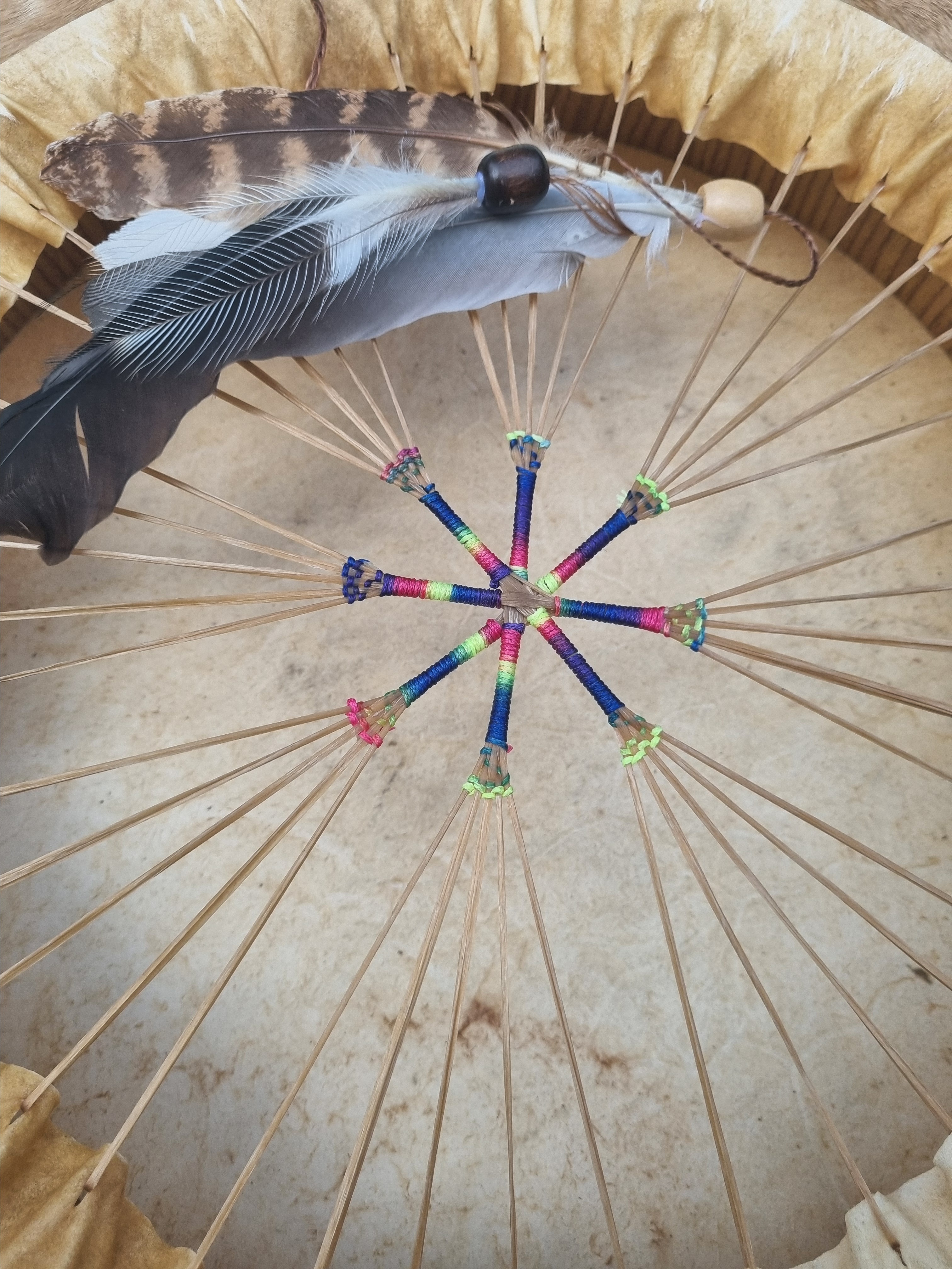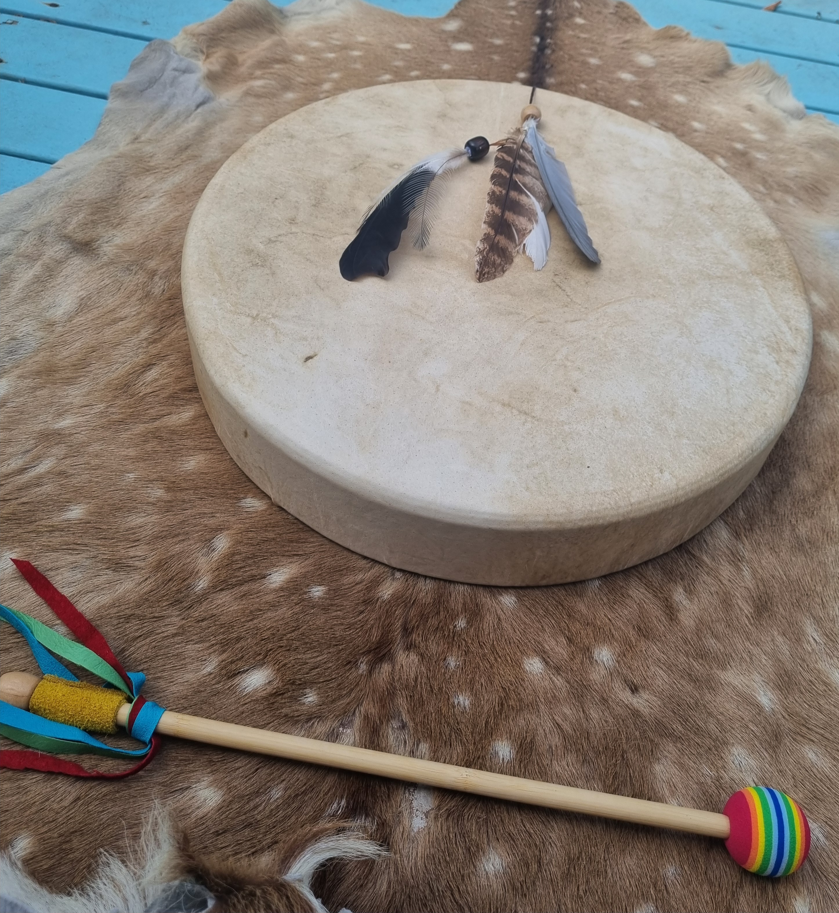 This DRUM has been lovingly hand crafted & blessed in Australia in a native American style & laced with the MEDICINE WHEEL weave representing the four directions, the four seasons, the four coloured people of MOTHER EARTH and the four states of our being etc. and each with their direct connection to Source... GREAT SPIRIT. The included beater is natural wood & leather or felt. Drum Care instructions are also included.