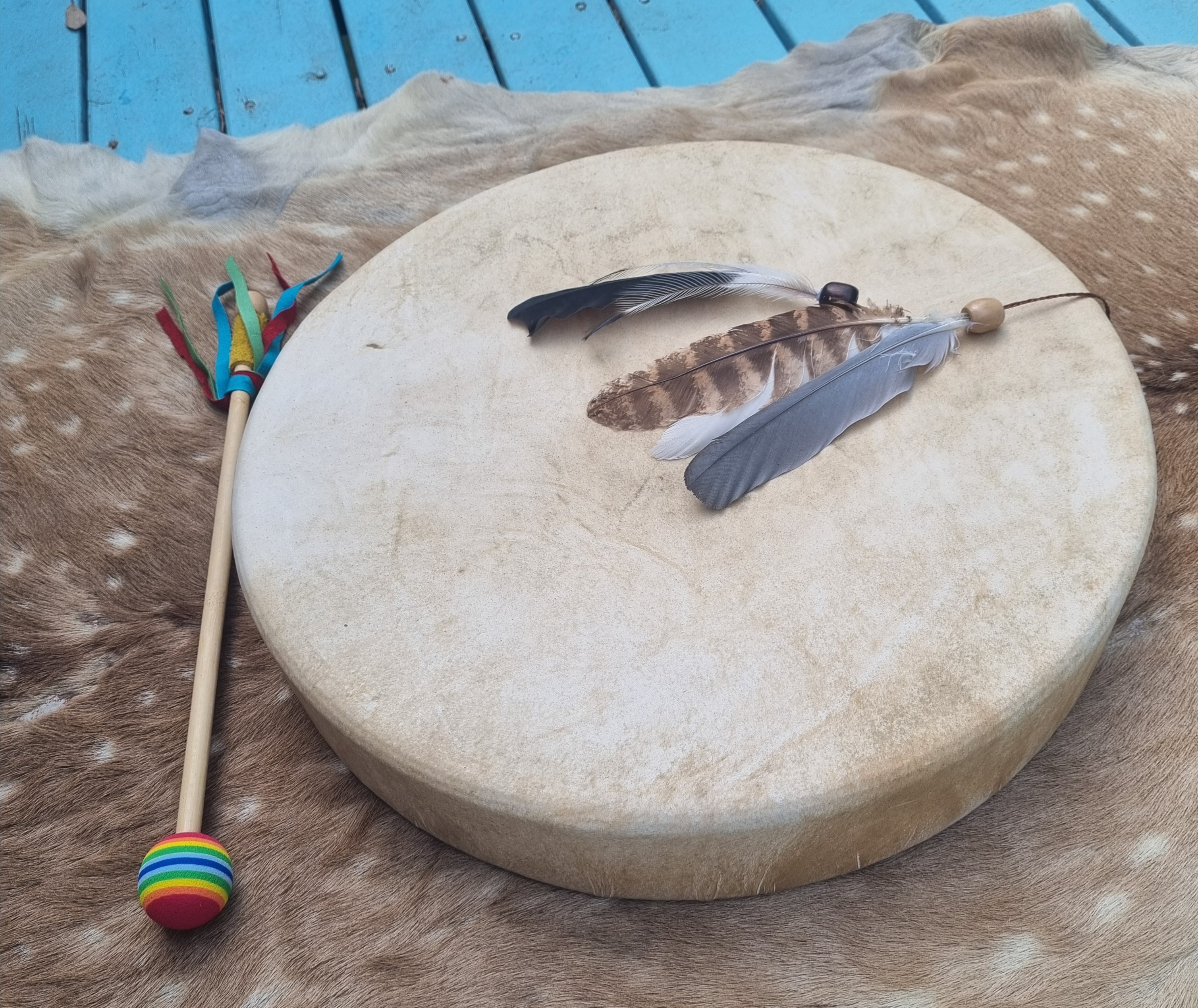 This is a creative loving instrument for healing & for connection to spirit & soul. In Native traditions it is believed that the drum is a living thing & the spirit of the animals & trees of which the drum is made, live in the drum. When a drum finds a partner , it is a life-long relationship. Drumming can provide solace, relief from anger, courage when afraid, unites drummer with all life form - a single heartbeat restoring balance & harmony, which can heal & soothe the mind & reach our very soul.